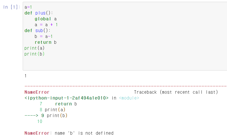 정의되지 않았다는 오류가 뜬다. 이유는 앞서말했듯 지역변수는 함수내에서만 존재하므로 밖에서는 print될 수 없다.