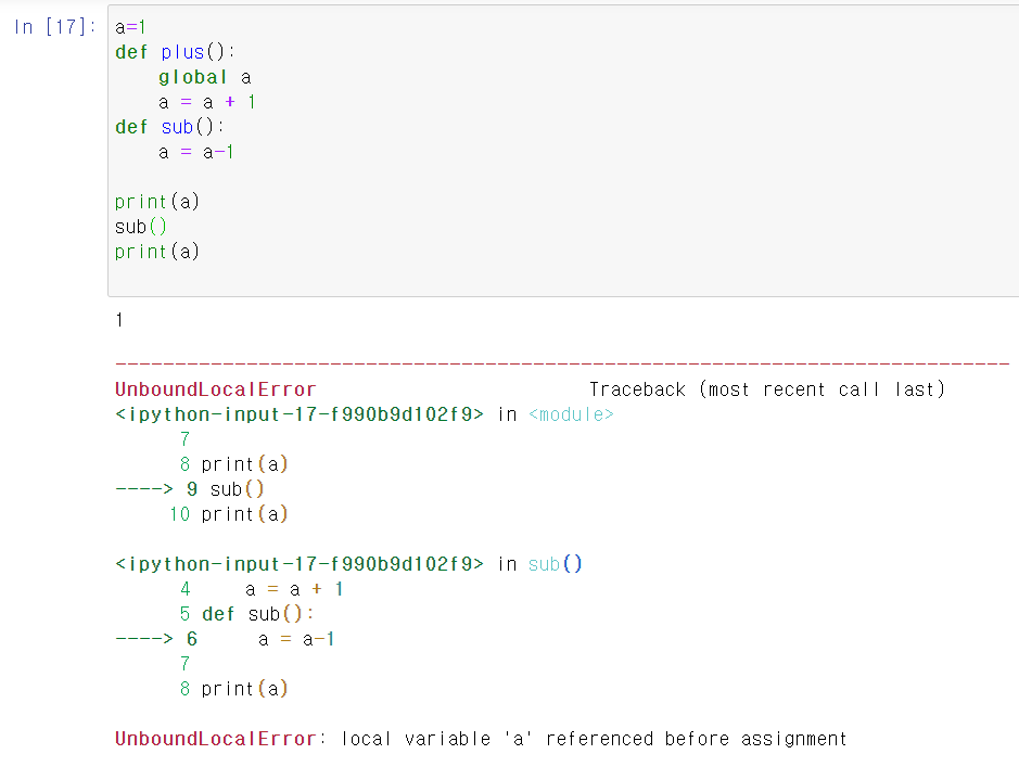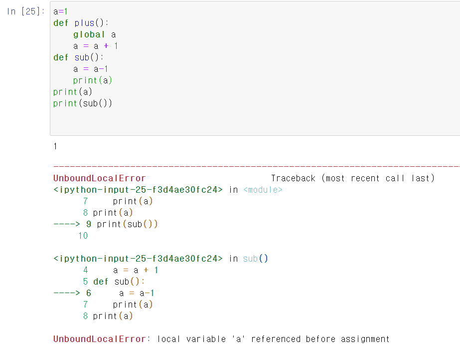 위 코드에서는 sub()라는 함수를 에서 a는 이미 존재하기 때문에 지역변수로 할 수 없는 것이다.