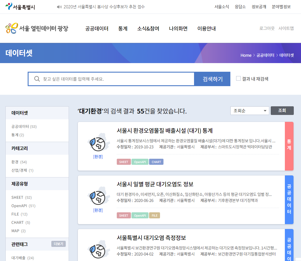 서울 열린데이터 광장에 회원가입이 되어있다는 전제로 '대기환경'이란 키워드를 검색했다.
