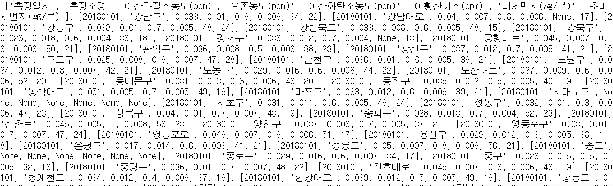 이전에 비해 상당히 의미있는 데이터들이 출력되었다. list in list형식으로 행단위로 끊어서 집어 넣어진 상태다.
