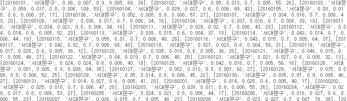 다시 for문을 이용하여 selectYY리스트에 서대문구에 대한 대기환경 데이터를 집어넣었다. 제대로 됐는지 확인하기 위해 잠시 print(select16)을 넣고 실행해보자.
