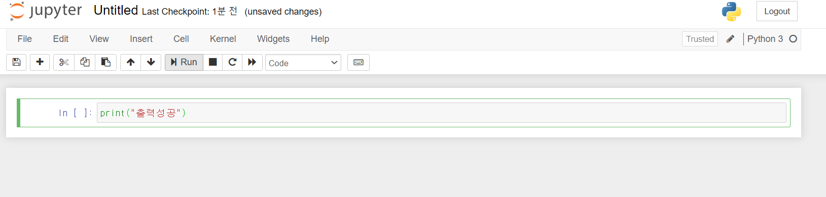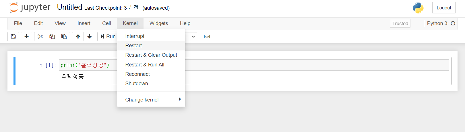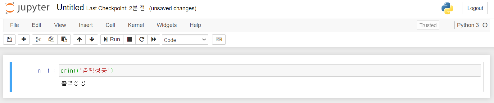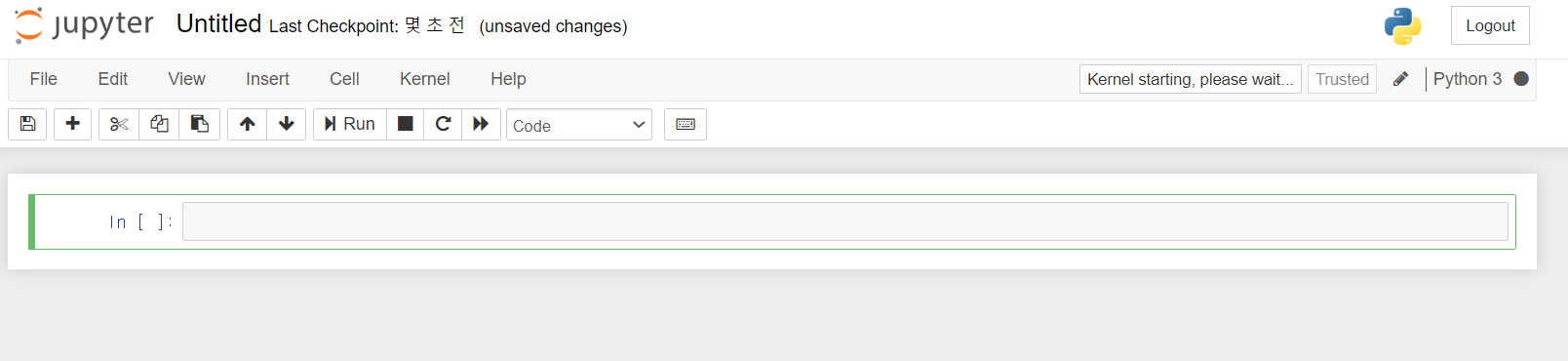 참고로 ln[ ]안의 숫자는 실행횟수를 의미하고 숫자가 아닌 *이 있을 경우 실행이 끝나지 않았음을 의미 한다. 계속 실행되고 있다는 뜻이다. 그럴때는 Run옆에 네모 버튼을 클릭하거나