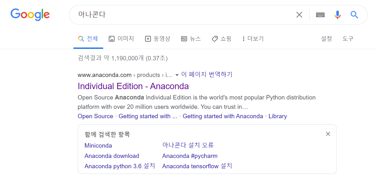 구글에 아나콘다라고만 검색해도 다음과 같이 뜰텐데 바로 보이는 사이트에 들어가면 된다.