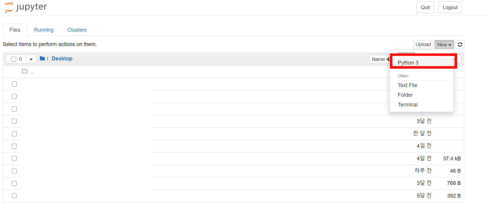 Desktop으로 간다음 오른쪽 위의 New에서 Python3을 클릭해주자.