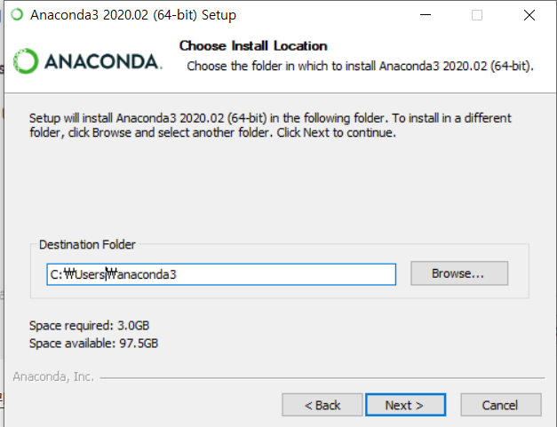 이제 저장위치를 설정해주면 된다. Browse를 통해 위치를 지정해줄 수 있다. 지정 후 Next를 눌러준다.
